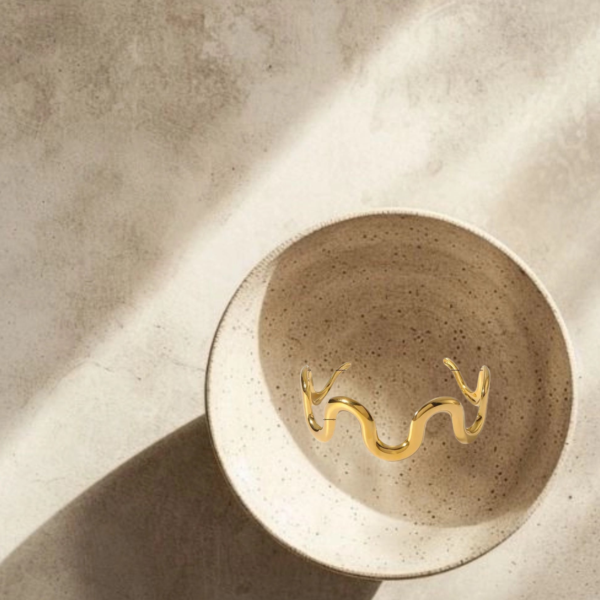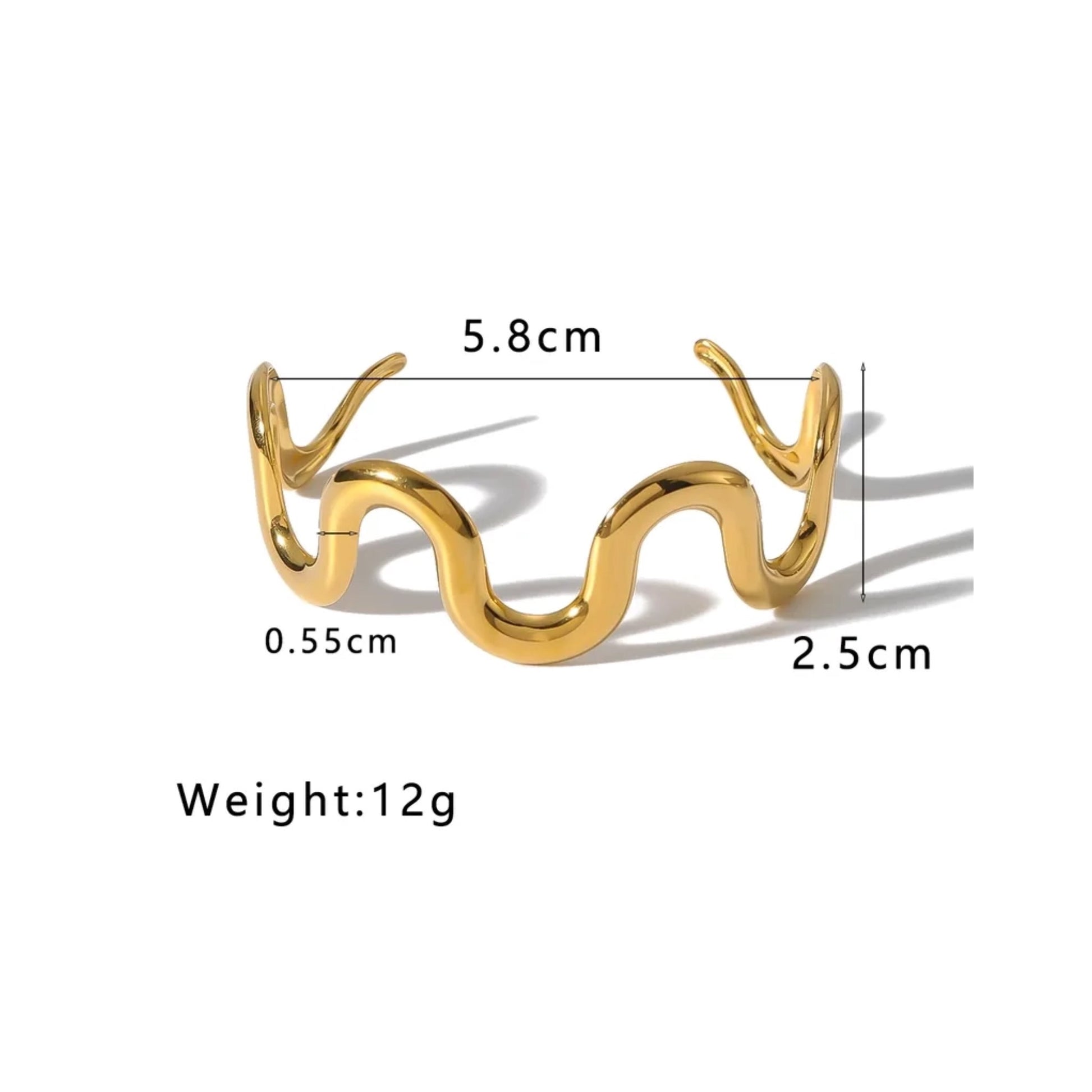 A sleek 18K gold-plated cuff bangle with a geometric design, perfect for summer days and glamorous nights.