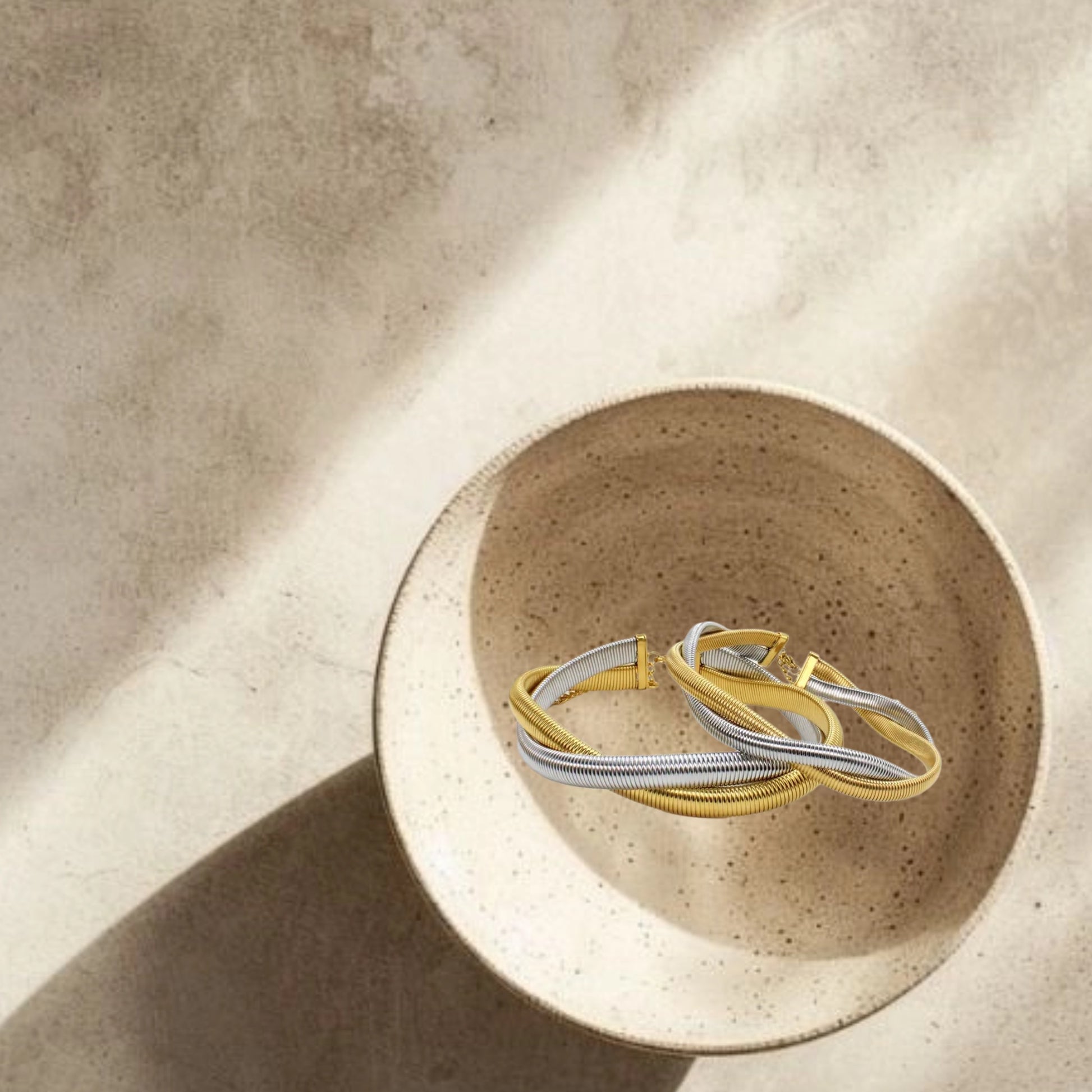A timeless two-tone twisted bracelet, crafted in silver and gold stainless steel for enduring elegance.