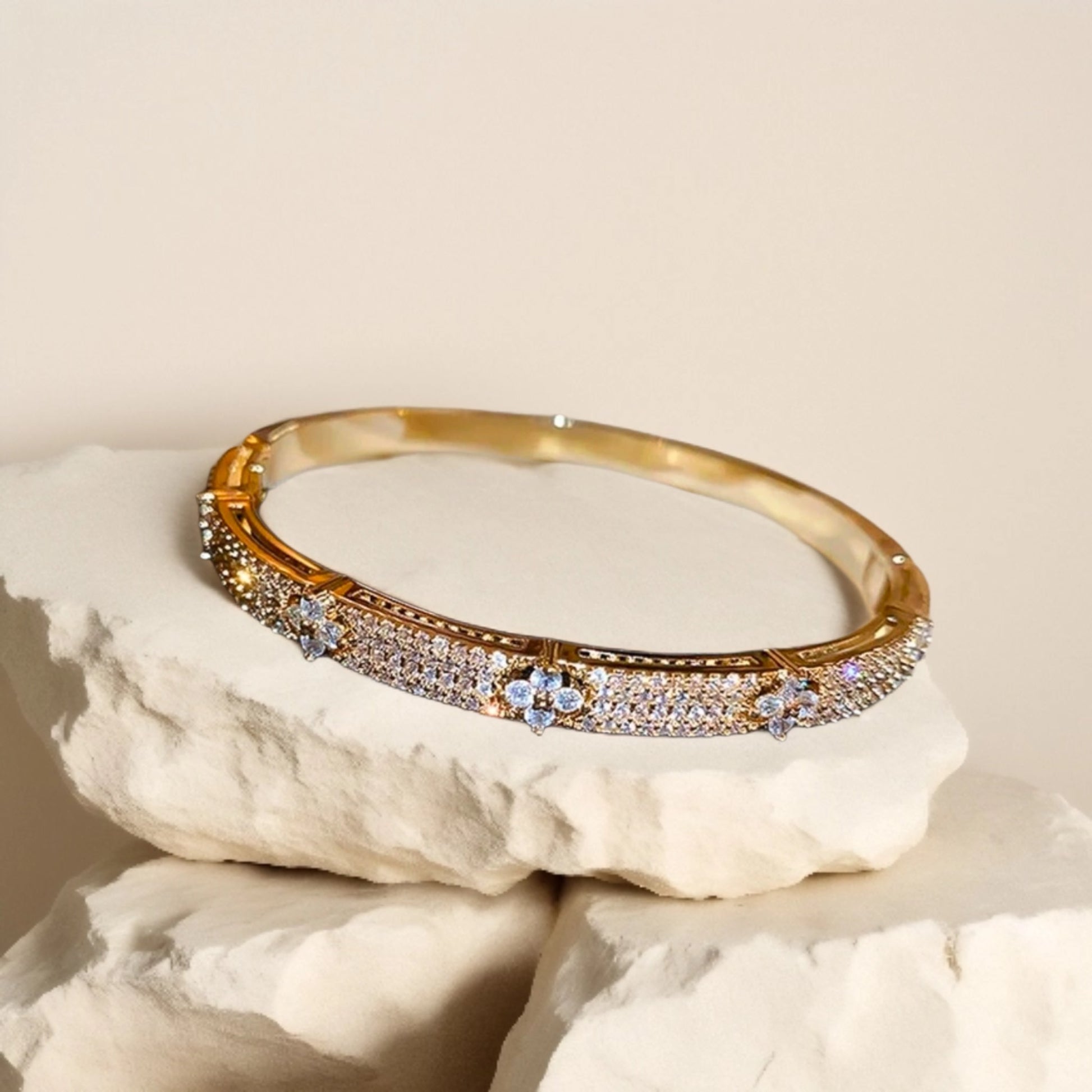Delicate and feminine, the Flora Petite Bangle features dainty stone-studded flowers accented by shimmering micro stones along a sleek metal band. Available in both gold and silver finishes, this charming piece brings a soft, graceful sparkle to your everyday style.