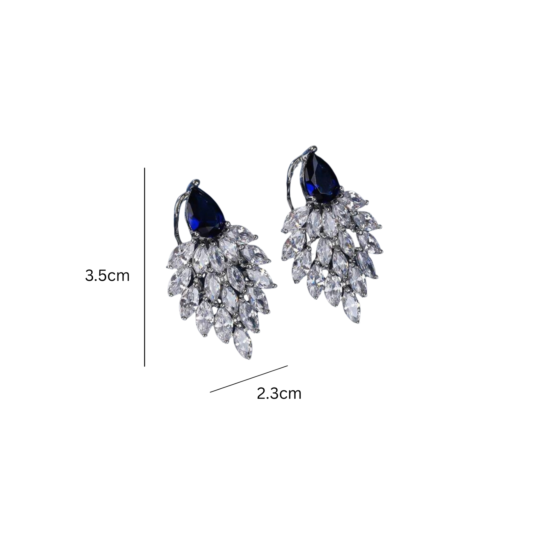 White gold plated drop earrings featuring a bold dark blue stone and delicate leaf-shaped cubic zirconia accents for a festive sparkle.