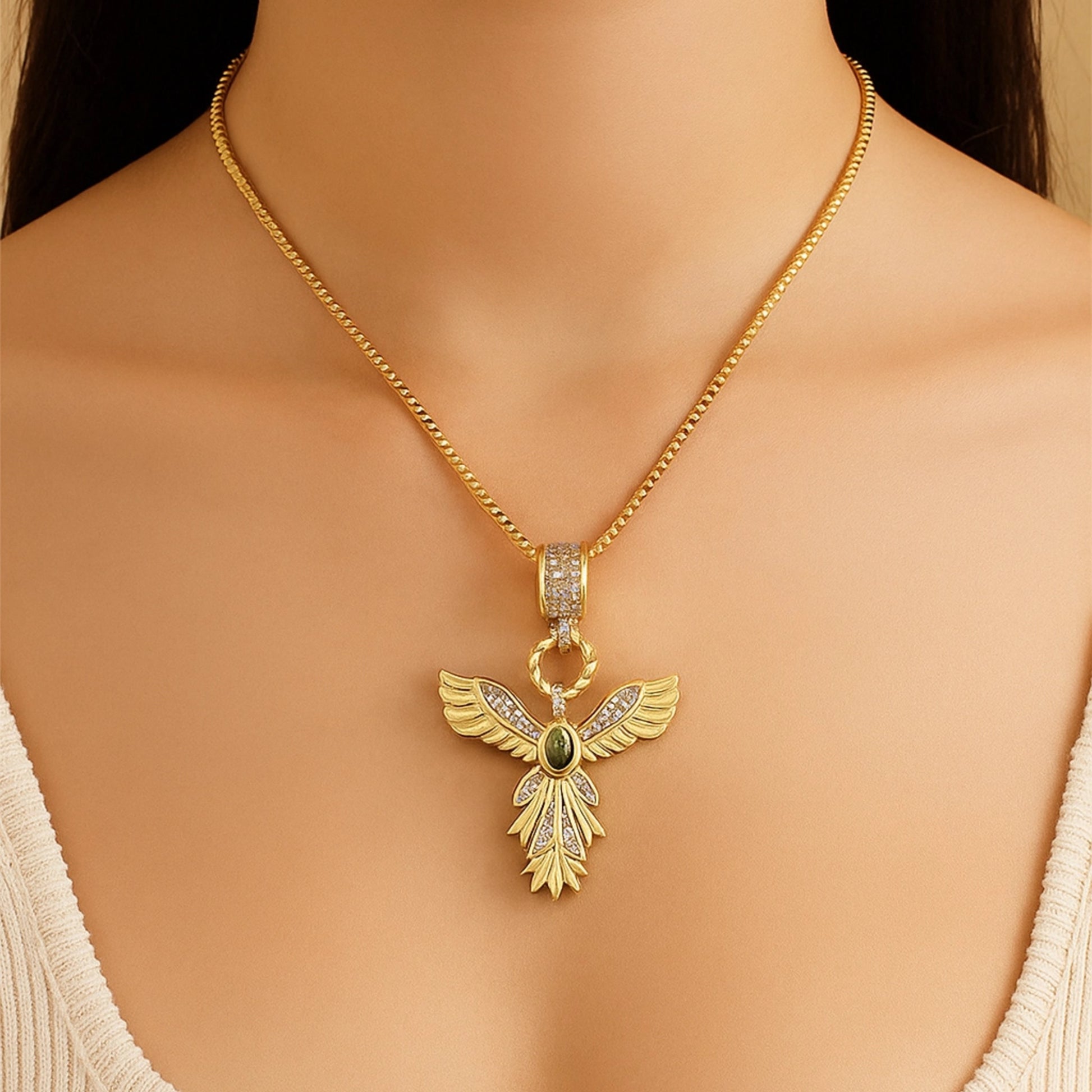 An 18K gold-plated phoenix pendant necklace, symbolizing rebirth, strength, and limitless possibilities.