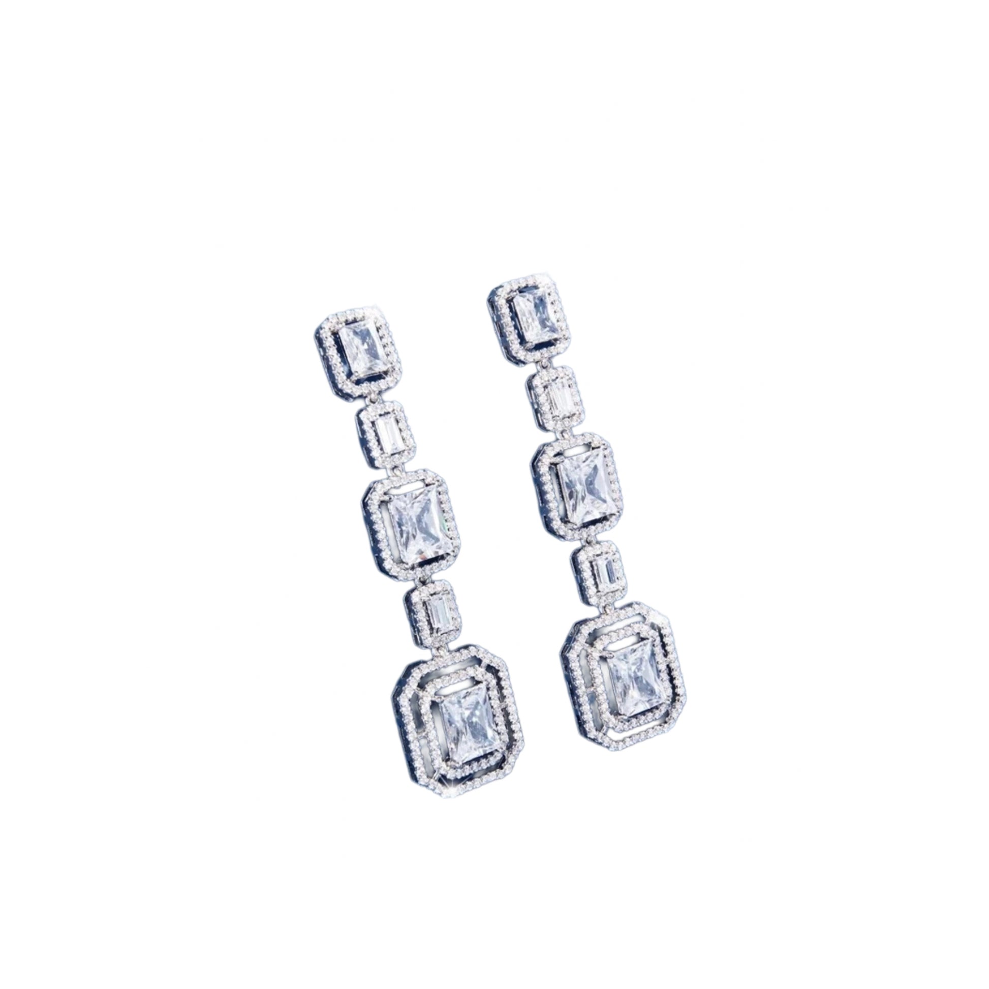 White gold plated drop earrings featuring graduated square-cut stones, culminating in a bold statement sparkle perfect for festive elegance.
